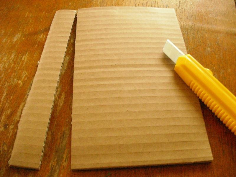 Сначала сделаем обложку. Чтобы наш DIY-travelog выглядел более-менее стильно, мы используем грубую сторону картонки, а глянцевая уйдёт внутрь. Кроме того, поскольку обложка должна будет отгибаться без усилий, а картон довольно неподатлив, мы просто отрежем ту часть обложки, что будет жёстко фиксирована как край корешка.