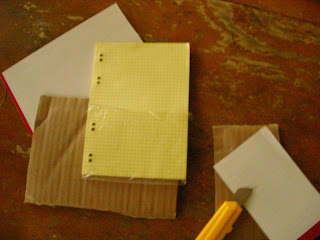Мне также понадобились резак для бумаги, ножницы, линейка (чтобы резак ехал по правильной траектории), толстый рекламный каталог (чтобы не портить резаком стол, хоть он и древний, как «Повесть о плъку Игореве») и два куска картона от коробки со свежекупленым пылесосом. Мои жёлтые листочки имеют перфорацию с левой стороны для скрепления при помощи скоросшивателя. Я поискал дома грубую (чтобы подходила по дизайну к картону) верёвку, дабы скрепить их, но не нашёл ничего подходящего. Ну и пусть. На помощь нам придут канцелярские зажимы. Поскольку у меня всё равно нет необходимости скреплять листки навсегда: после возвращения я всё равно вклею их в тот молескин, где хранятся заметки о прошлых поездках.